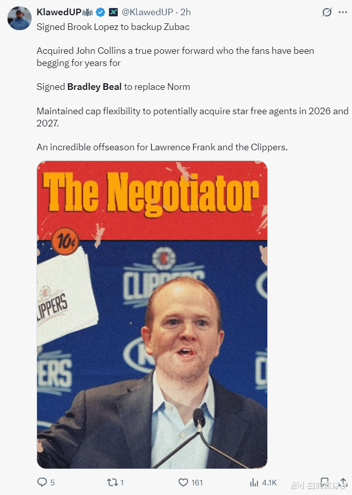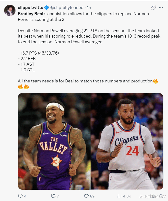 快船媒体写道:我们签下比尔后能充分弥补鲍威尔的空缺,尽管鲍威尔场均是22分,但在他的得分角色下滑后快船战绩更佳,赛季末快船18胜3负,鲍威尔场均只有16.7分,比尔只要能继续场均17分快船就已经很满足。