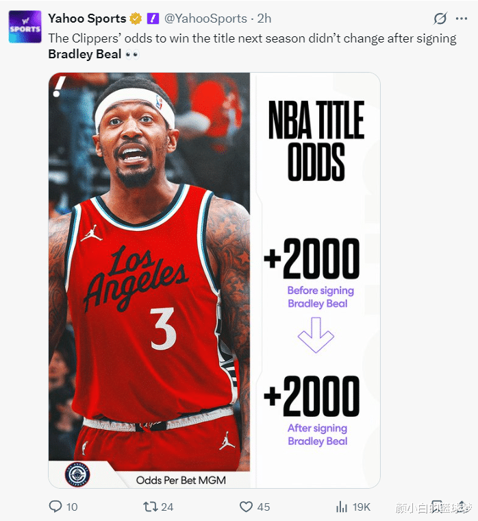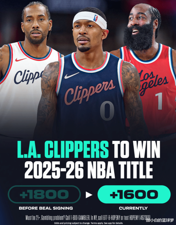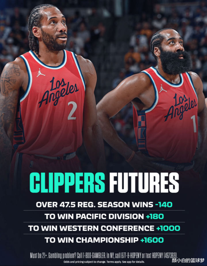 更多细节赔率也已经更新:常规赛超过47.5胜-140(几乎稳超),拿到太平洋赛区冠军+180,成为西部冠军+1000,拿到NBA总冠军+1600。看起来比尔对快船的提升还是挺大的。