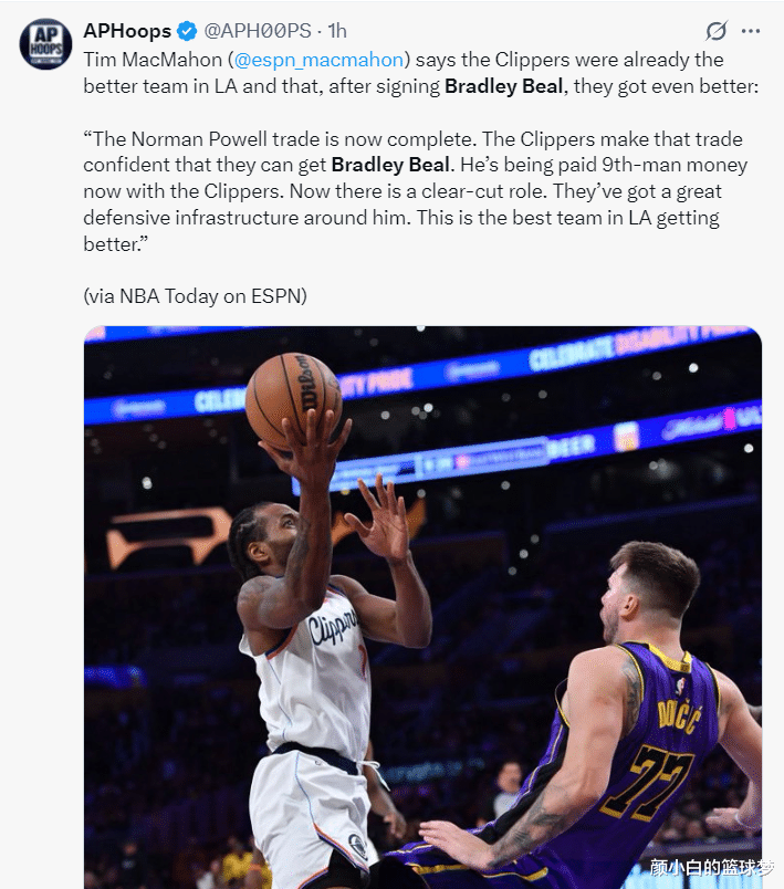 ESPN记者蒂姆-麦克马洪这样评价快船签下比尔:快船原本就是实力很强的球队,他们签下比尔后实力更是大幅提升,在快船交易鲍威尔时他们就对签下比尔信心满满,在快船比尔有一个明确的角色定位,这支球队有出色的防守体系,比尔可能会打球队第六人。